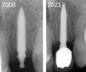 Having performed numerous such procedures between 1984 and 2003, in our clinic we have found that the same results are achievable WITHOUT SURGERY and WITHIN A FEW WEEKS, rather than months. Using our KEYHOLE techniquie there is no need to wear a removable denture as we create a temporary tooth at the first visit and usually complete the final porcelain crown a few weeks later.
