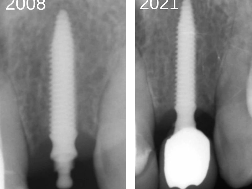 Having performed numerous such procedures between 1984 and 2003, in our clinic we have found that the same results are achievable WITHOUT SURGERY and WITHIN A FEW WEEKS, rather than months. Using our KEYHOLE techniquie there is no need to wear a removable denture as we create a temporary tooth at the first visit and usually complete the final porcelain crown a few weeks later.